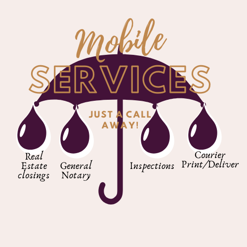 The convience of a Mobile Notary coming to your home, place of business, hospital, or nursing home, is a great service! Often times disabled or injured adults are unable to travel. I am here to serve my community with knowledgable, friendly, and efficient service!